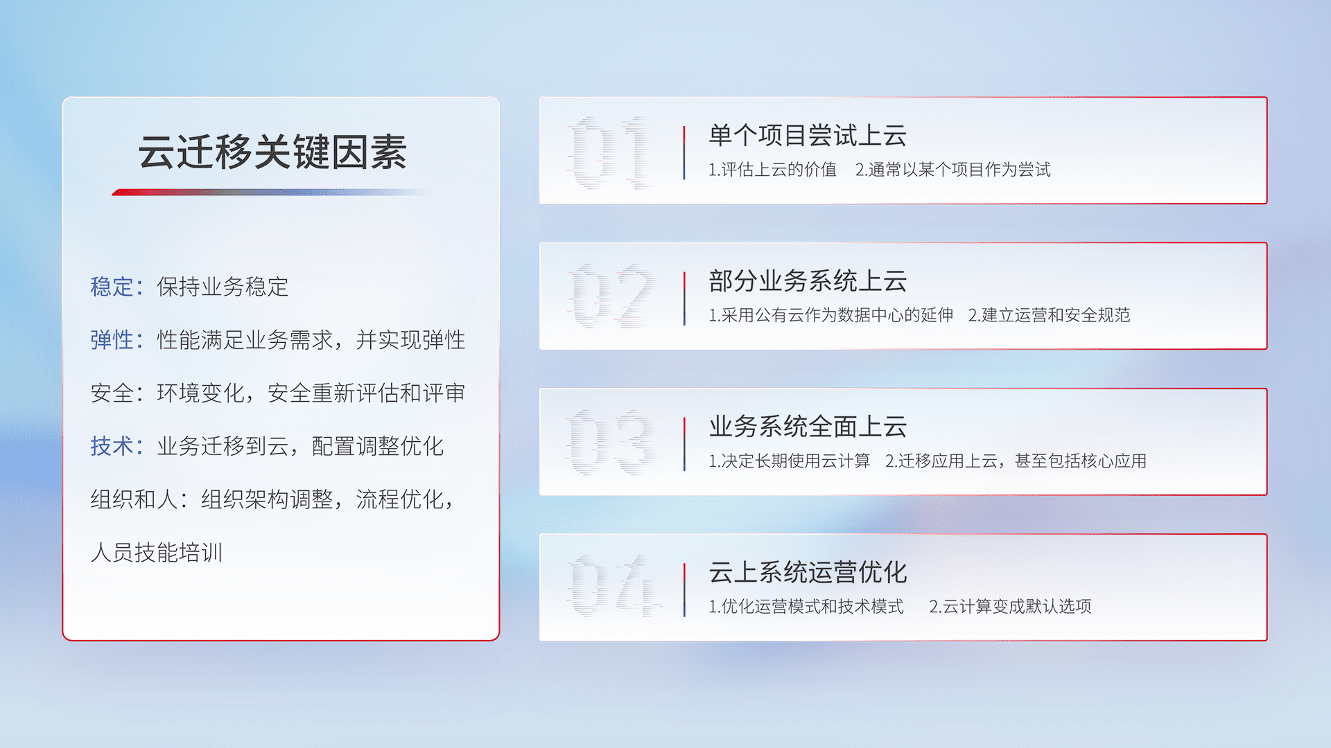 结合实际业务,,,,从规划设计、、云平台选型、、云原生改造、、、数据迁移、、、、集成交付,,,迁移全过程为客户识别最佳上云路径,,,做好风险识别管理,,,,设计网络架构、、、身份权限、、安全审计合规、、、操作审计、、日志审计、、、监控告警策略、、多站点容灾设计等,,对云上基础设施进行整体规划,,,提升IT治理水平,,,,以满足弹性、、、高可用、、、、高性能的需求。。
