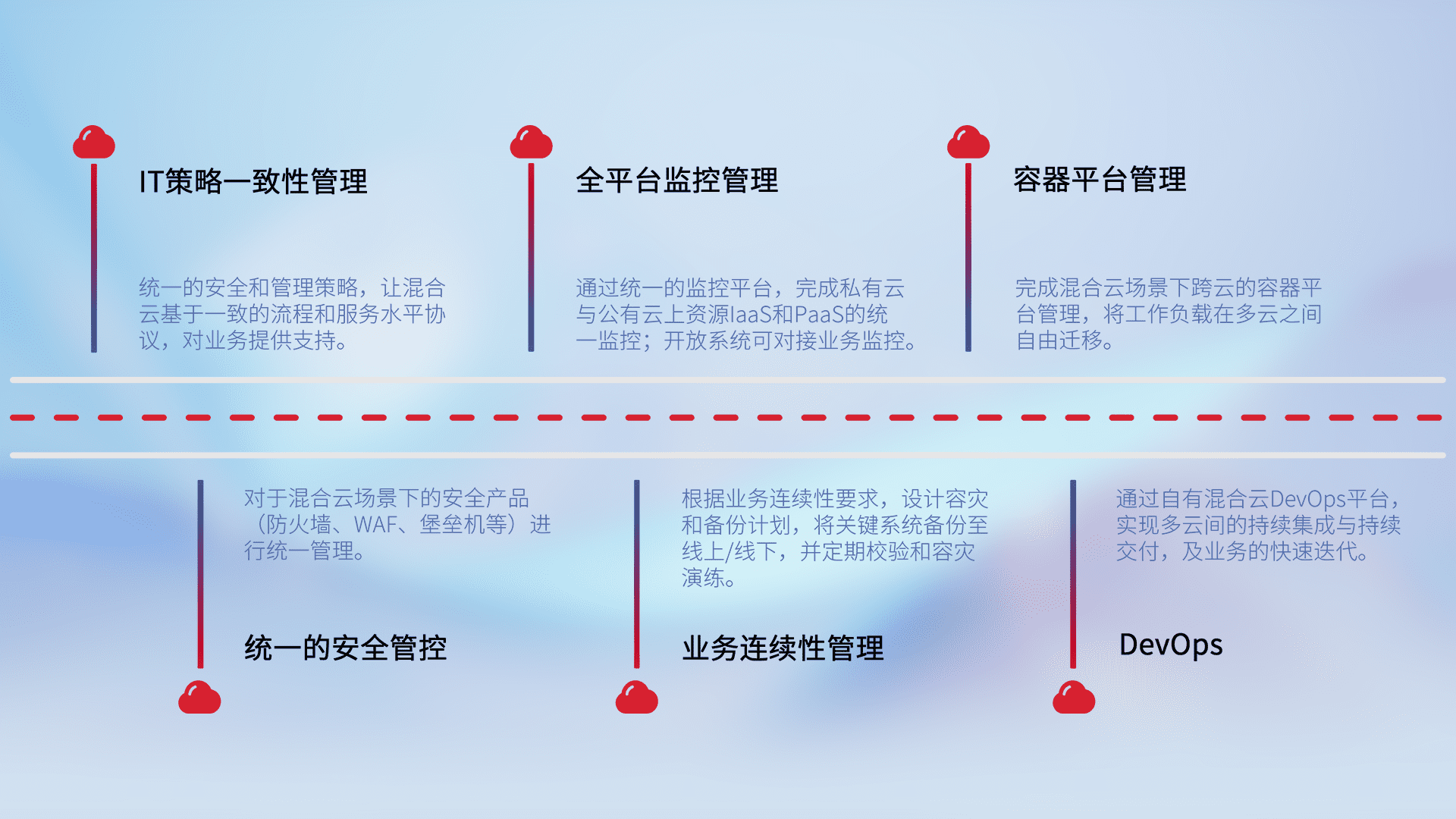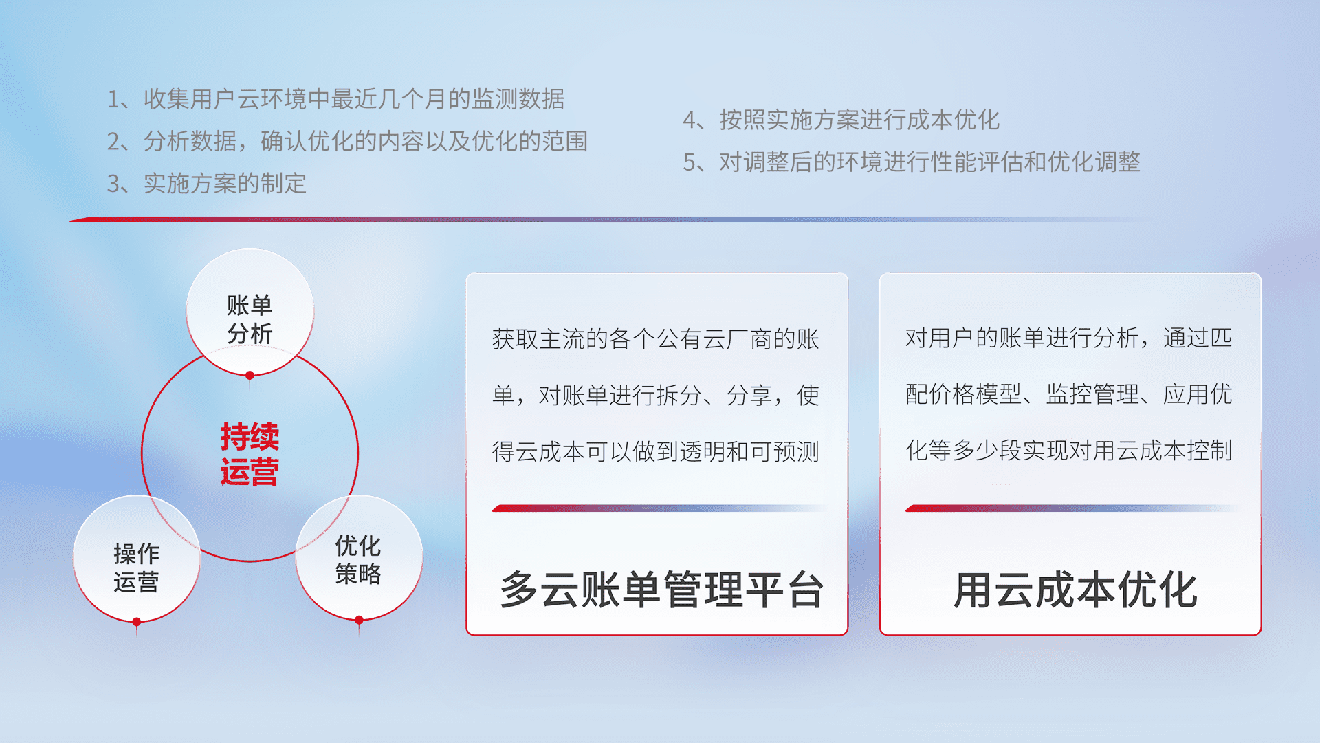 通过多云纳管,,,以统一的资源数据模型把客户的云资源进行抽象和封装,,,,进而实现对多云资源的统一操作,,,,保障云资源管理的可靠性、、、稳定性与可用性。。。。量身定制化运维内容,,配置、、、、开发运维、、、补丁管理、、、备份、、、、监控、、认证和访问管理、、审计和日常巡检等,,,,保障在用云过程中的可靠度,,,稳定度以及高可用率。。。。